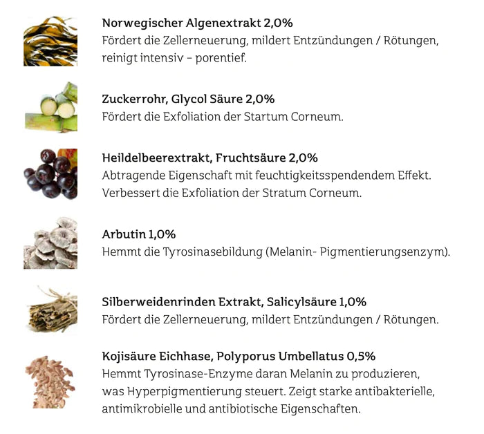 Führt zu einem leuchtend, hellen Teint. Porenverfeinernd. Glattere, weichere Haut. Hemmt Tyrosinaseenzyme, die Melanin produzieren. Regeneriert die Haut. Parabenfrei.